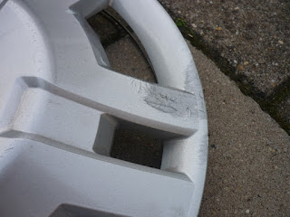Een ander klusje betrof de drie wieldoppen van de camper. Ik ben er een verloren ergens in Hongarije. Nu ik dat zo schrijf, bedenk ik opeens : ik had ons adres aan de binnenkant moeten noteren. Ha! Niet om dat ding terug te krijgen, maar meer vanwege een mogelijke reactie. Maar goed, ik heb er nog drie. Ik heb ze schoongemaakt. En toch zien ze er niet zo fraai uit. Die plastic schijven zijn nogal slecht gespoten. De lak hecht niet overal goed op de kunststof en is gaan bladderen en bubbelen. En dat alles krijg je erbij voor zo'n 120 euro! Oké, ik vond een site waar de set was afgeprijsd tot ruim 76 euro, exclusief verzending. Een zo'n dop kost normaal 30 euro! Kassa!