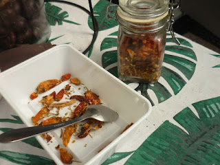 Ik heb wat potgrond in zo'n nasibakje gedaan en daarin de zaadjes van de gepelde pepertjes geplant. Ik heb ook nog wat zaadjes uit het potje met gedroogde Bird Eye pepertjes uit de keuken gebruikt. Die liggen los in het potje tussen de gedroogde pepers. Met een lepeltje heb ik er een paar uit geschept. Van die pepertjes krijg ik na het eten ervan totaal geen last. Van andere wel. Dat geldt trouwens ook voor bepaalde sambals. Als er nog pitjes / zaadjes inzitten werken die subiet op mijn darmen. De pepertjes hebben trouwens een zeer verschillende mate van scherpte. Sommige proef je nauwelijks terwijl andere (vooral kleine) de vlammen uit mijn oren doen slaan. Maar toch zonder verdere vervelende bijverschijnselen.