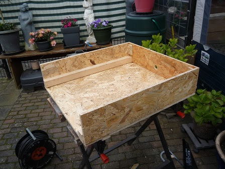 Ik heb de ombouw gemaakt, zij het weer als een bouwpakketje. Maar dit keer met minder maar wel met grotere onderdelen : een voorzijde, een deksel en twee zijkanten. Ik ga ze ter plaatse monteren. Aan een zijkant zal ik ongetwijfeld nog wat openingen moeten uitzagen vanwege de slangen die aan die kant het huisje ingaan. De ombouw krijgt nog een bruin likje verf, zodat het qua kleur past bij de rest.