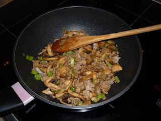 Ik heb de gehakt in wat olie geruld en daar de ringetjes lente-ui, wat knoflook, een met de tjobek (vijzel) fijngemalen peper, wat trassi, een scheut ketjap manis en de gesneden champignons aan toegevoegd. Die pepertjes kunnen heel verschillend zijn wat de pittigheid betreft. De ene keer zet één pepertje je hele mond in brand, de andere keer leiden zelfs 3 stuks niet tot een pittige smaak. Ik begin daarom maar met 1. Daarna even proeven of het voldoende is. Nou, dit keer was het zééér voldoende! 😂